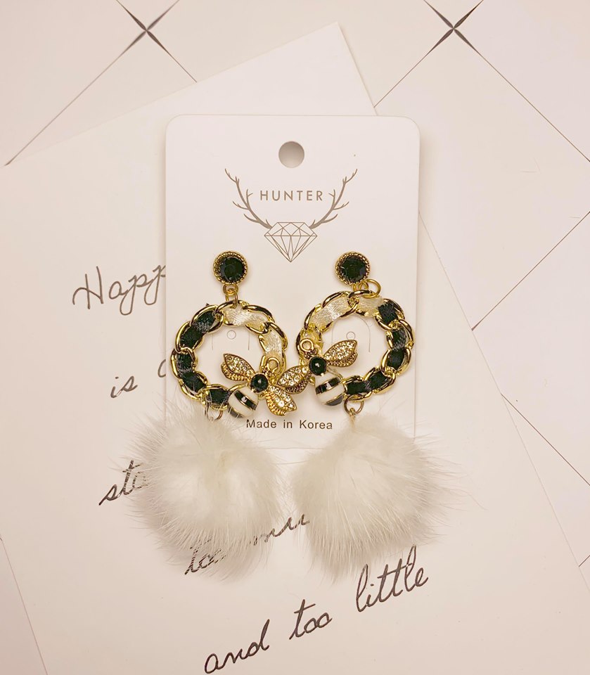 氣質韓系編織圓環蜜蜂絨球球耳環